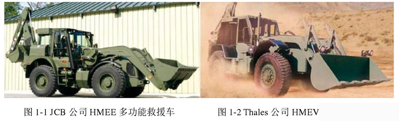 當(dāng)今世界范圍內(nèi),英美日澳等發(fā)達(dá)國(guó)家研制的多功能緊急救援車處于業(yè)內(nèi)較為領(lǐng)先的地位,其中較為典型的如圖1所示英國(guó)JCB公司為美軍設(shè)計(jì)開(kāi)發(fā)的HMEE(High Mobility Engineer Excavator),是一種高機(jī)動(dòng)多功能挖掘機(jī),該機(jī)型一般用于戰(zhàn)場(chǎng)挖掘任務(wù)和戰(zhàn)場(chǎng)救援,能夠配備液壓錘、鏟斗、挖斗等作業(yè)工具,底盤(pán)系統(tǒng)采用多模式空氣懸掛系統(tǒng),可保證高速行駛平順性和正常作業(yè);采用全輪驅(qū)動(dòng)能夠應(yīng)對(duì)各種復(fù)雜地形,具有全輪轉(zhuǎn)向/蟹行轉(zhuǎn)向功能,為避免車輛喪失機(jī)動(dòng)性,車輛利用高強(qiáng)度輪胎,能在面積狹小的場(chǎng)合實(shí)施作業(yè),能夠由飛機(jī)進(jìn)行遠(yuǎn)距離運(yùn)輸以實(shí)現(xiàn)快速移動(dòng)。另外,澳大利亞 Thales 公司為美軍設(shè)計(jì)的 HMEV(High Mobility Engineering vehicle)與 HMEE 相類似,如圖 2 所示,同為較典型的高機(jī)動(dòng)多功能緊急救援車。